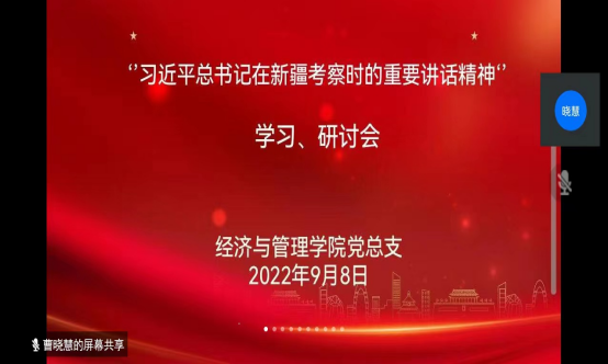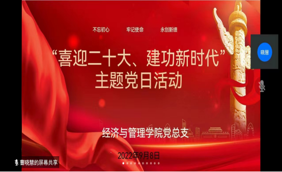 为进一步提高我院党员队伍整体素质,更好的发挥党员的先锋模范作用,激励党员在各自的工作岗位上尽职尽责、积极进取、甘于奉献。9月8日经济与管理学院党总支通过线上方式开展“喜迎二十大、建功新时代”主题党日活动。全体党员参加了此次活动。