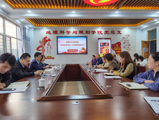 9月21日,beat365在线唯一官网党委书记朱玉东,党委委员、统战部部长张秀文,党政办公室副主任郭英,宣传部副部长田博一行深入地理科学与规划学院调研指导“最强党支部”建设工作。学院全体无课教师参会。