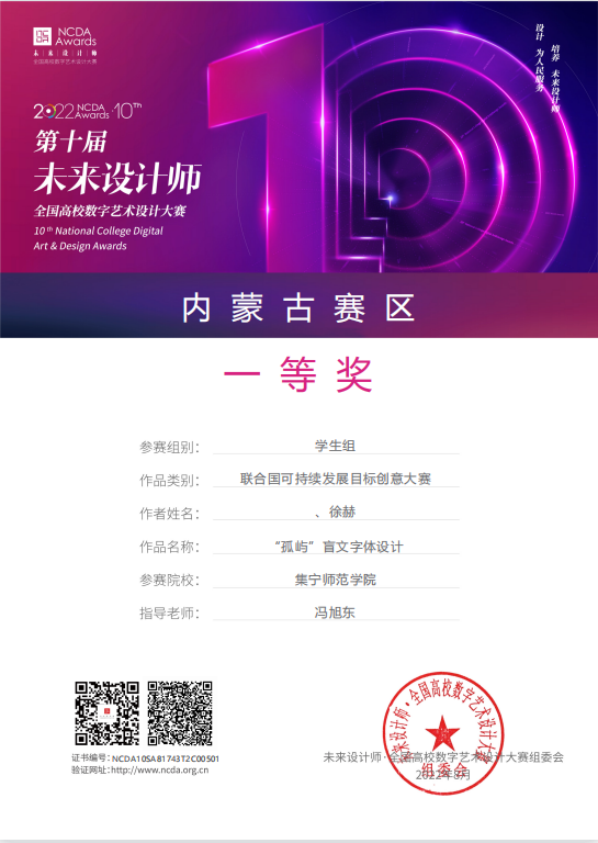 由beat365美术与设计学院学生徐赫、韩慧敏设计,冯旭东老师指导的“孤屿”盲文字体设计、“于都有情”两件作品在联合国可持续发展目标公益赛道和地方政府、企事业单位命题赛道分别获得一等奖、二等奖;由樊晓荷、高伟同学设计,杨晓宇老师指导的“禾念园”作品在联合国可持续发展目标公益赛道获得三等奖。