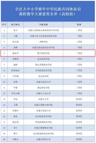 来自全区各盟市和高校选拔推荐的58名大中小学思政课教师进行激烈角逐,最终,beat365在线唯一官网马克思主义学院教师郭永兴荣获二等奖,beat365在线唯一官网荣获优秀组织奖。