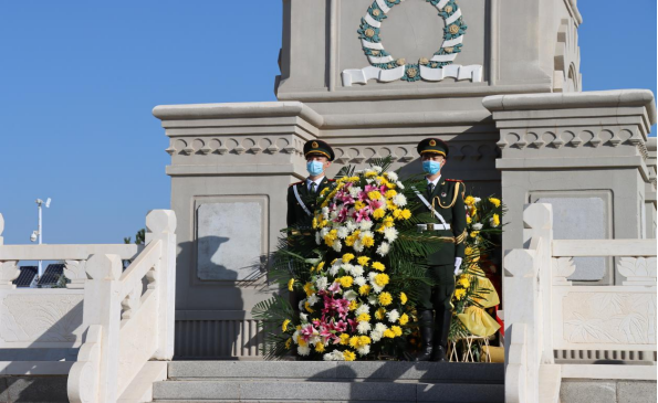 当深情的《献花曲》响起时,礼兵稳稳抬起花篮,缓步走向人民英雄纪念碑,将花篮摆放在纪念碑基座上。