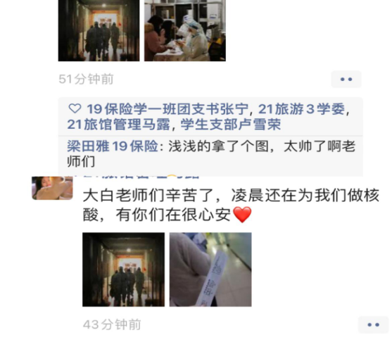 在疫情防控路上,师生党员当先锋作表率,学院每位同学也积极配合,大家携手并肩,共同筑牢防疫屏障,同学们以不同方式为坚守在一线的老师表达了感谢,通过情感的交流,更体现了理解的共鸣,大家齐心协力共同打赢这场疫情防控阻击战。