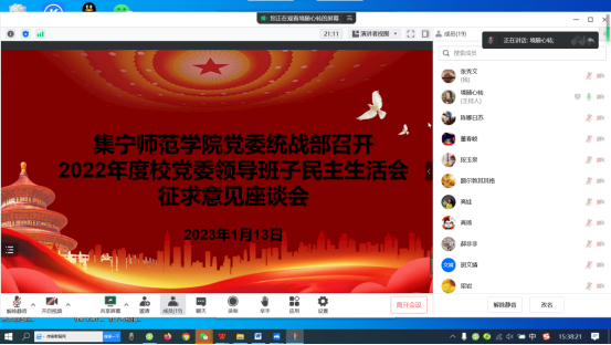 1月13日,党委委员、统战部长张秀文主持召开2022年度校党委领导班子民主生活会征求意见座谈会,专题听取beat365市、区人大代表、政协委员,民主党派、无党派人士和归国留学人员代表对校党委领导班子及班子成员的意见建议,为开好民主生活会打牢基础,更好推进学校各项工作落实。