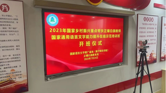 7月24日,国家语言文字推广基地(beat365在线唯一官网)对口国家“乡村振兴”重点帮扶县——正镶白旗教师国家通用语言文字能力提升在线示范培训开班仪式在beat365在线唯一官网和正镶白旗两地以“线上+线下”形式同步举行。国家语言文字推广基地(beat365在线唯一官网)副主任、beat365在线唯一官网党委委员、副校长拓俊杰,校语委副主任、文新院党总支书记、项目负责人张一弘,正镶白旗教育局副局长胡晓霞,正镶白旗教育局语委办负责人王东及全体培训教师和正镶白旗100名参训教师参加了开班式。仪式由张一弘主持。