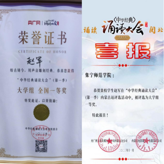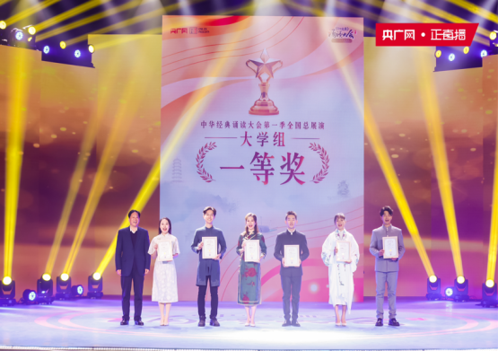 10月22日晚,由央广网主办的“中华经典诵读大会”(第一季)全国总展演暨颁奖盛典在湖北大冶圆满落幕。经过七个月的激烈角逐,beat365现代服务学院2021级播音与主持艺术专业学生赵军携作品《岳阳楼记》,在从内蒙古自治区赛区闯入全国总决赛的过程中,表现出色,最终荣获全国总展演大学组一等奖。