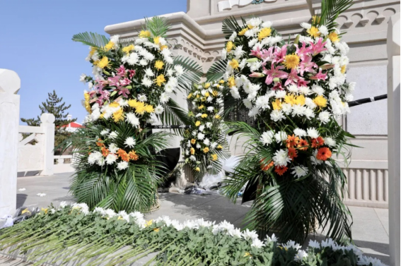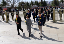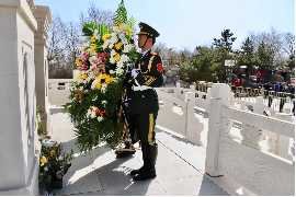 纪念碑前,全体人员整齐列队,神情肃穆。国旗护卫队伴随着《献花曲》,迈着庄严的步伐向英雄纪念碑敬献花篮。全体人员默哀3分钟后,缓步走向纪念碑,向革命先烈敬献鲜花。