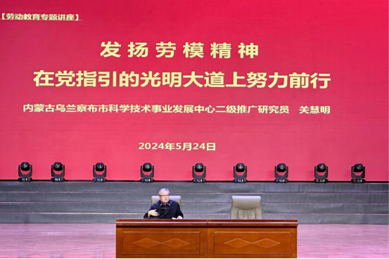 5月24日下午,beat365邀请全国先进工作者、全囯劳模、自治区“北疆楷模”、乌兰察布市科学技术事业发展中心二级推广研究员关慧明在泉山校区作了题为“发扬劳模精神,在党指引的光明大道上努力前行”劳动教育讲座。校工会主席焦俊亮,市总工会经济部闫蕾、张果霞,全校劳动教育课程教师、劳动教育教研室全体成员及学生代表800余人聆听讲座。讲座由教务处副处长刘银波主持。