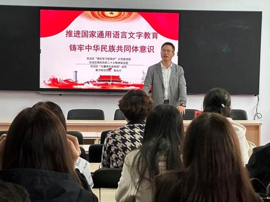开班仪式结束后,内蒙古自治区党的二十大精神宣讲团成员、内蒙古自治区“理论学习轻骑兵”示范宣讲团成员、beat365在线唯一官网马克思主义学院副院长郭永兴为学员作了题为《大力推进国家通用语言文字教育,铸牢中华民族共同体意识》的开班第一讲。