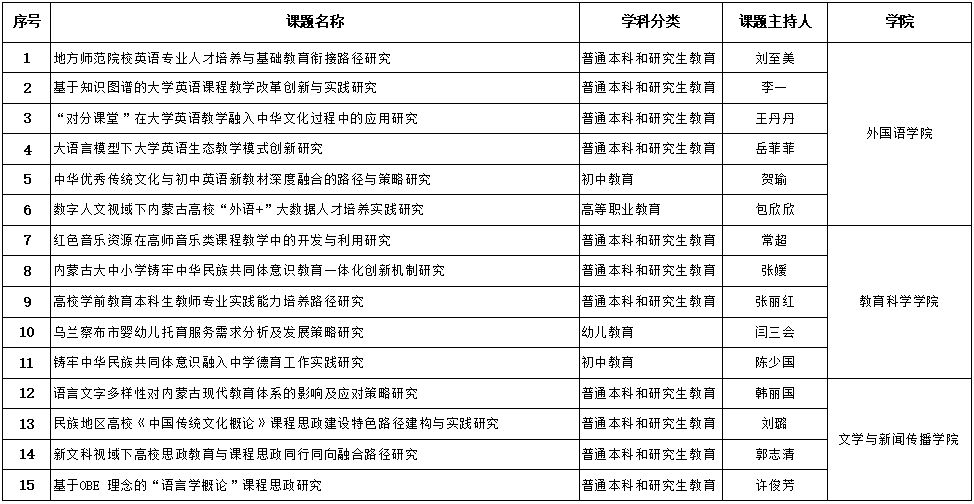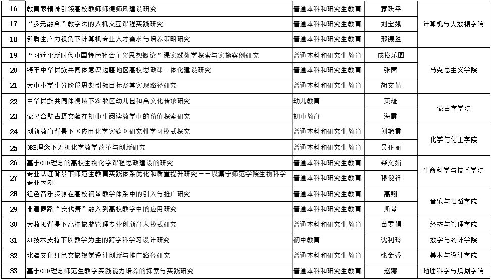 根据立项学院分布,外国语学院立项6项,教育科学学院立项5项,文学与新闻传播学院立项4项,计算机与大数据学院和马克思主义学院各立项3项,蒙古学学院、化学与化工学院、生命科学与技术学院、音乐与舞蹈学院各立项2项,经济与管理学院、美术与设计学院、地理科学与规划学院、数学与统计学院各立项1项。