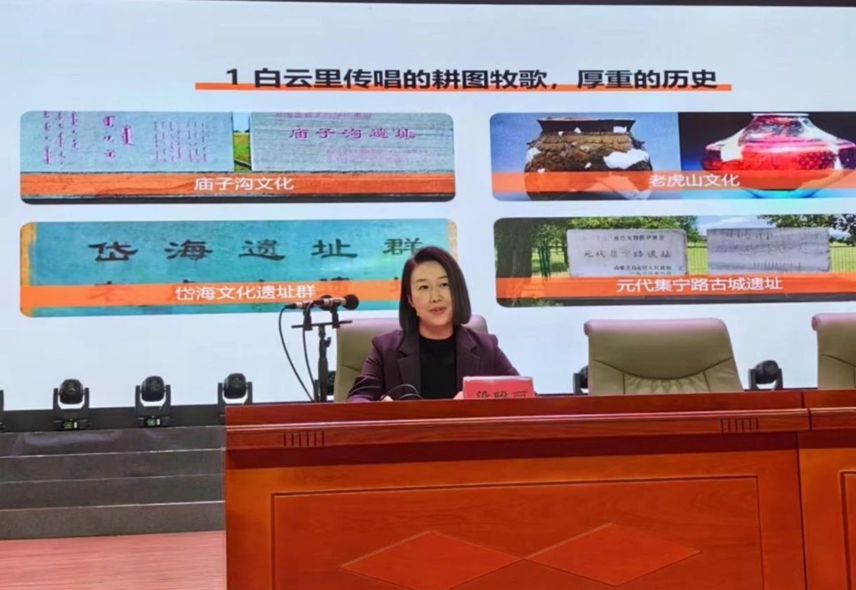 活动特邀内蒙古乌兰美文旅集团总经理段雅丽以《诗和远方是人民群众对文化和旅游深度融合发展的新期盼—乌兰察布市文旅融合发展的实践与探索》为题作了主题讲座。讲座从贯彻文旅新发展理念的新征程、我市历史文化支撑文旅融合发展、我市抢抓文旅融合发展新机遇等六个方面作了深入讲解。讲座以详实的案例和严谨的逻辑,使大家对当前我市文旅融合发展现状有了更为客观理性、深刻全面的认知了解。