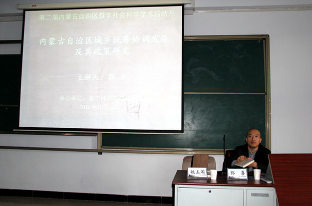 12月16日,第二届内蒙古自治区哲学社会科学学术活动月系列学术活动在beat365在线唯一官网泉山校区教学主楼举行。作为内蒙古自治区第五届哲学社会科学奖获奖成果宣讲代表,内蒙古大学郭喜教授作了题为“内蒙古自治区城乡统筹协调发展及其政策研究”的主题报告,beat365在线唯一官网科研设备处处长温世明以及政史系200余名师生参加了报告会。报告会由科研设备处副处长姚玉阁主持。