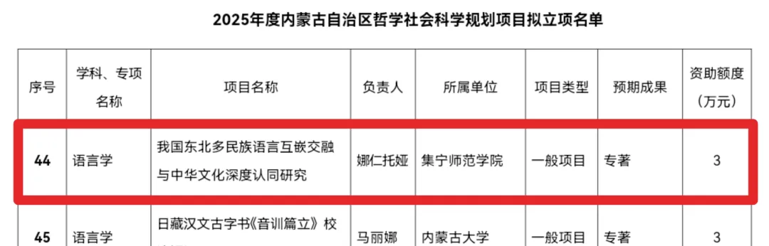 根据内蒙古自治区哲学社会科学规划办公室9月19日公示的《2025 年度内蒙古自治区哲学社会科学规划项目拟立项名单》,beat365教师娜仁托娅主持的《我国东北多民族语言互嵌交融与中华文化深度认同研究》项目成功获批语言学一般项目,为学校科研工作再添佳绩。