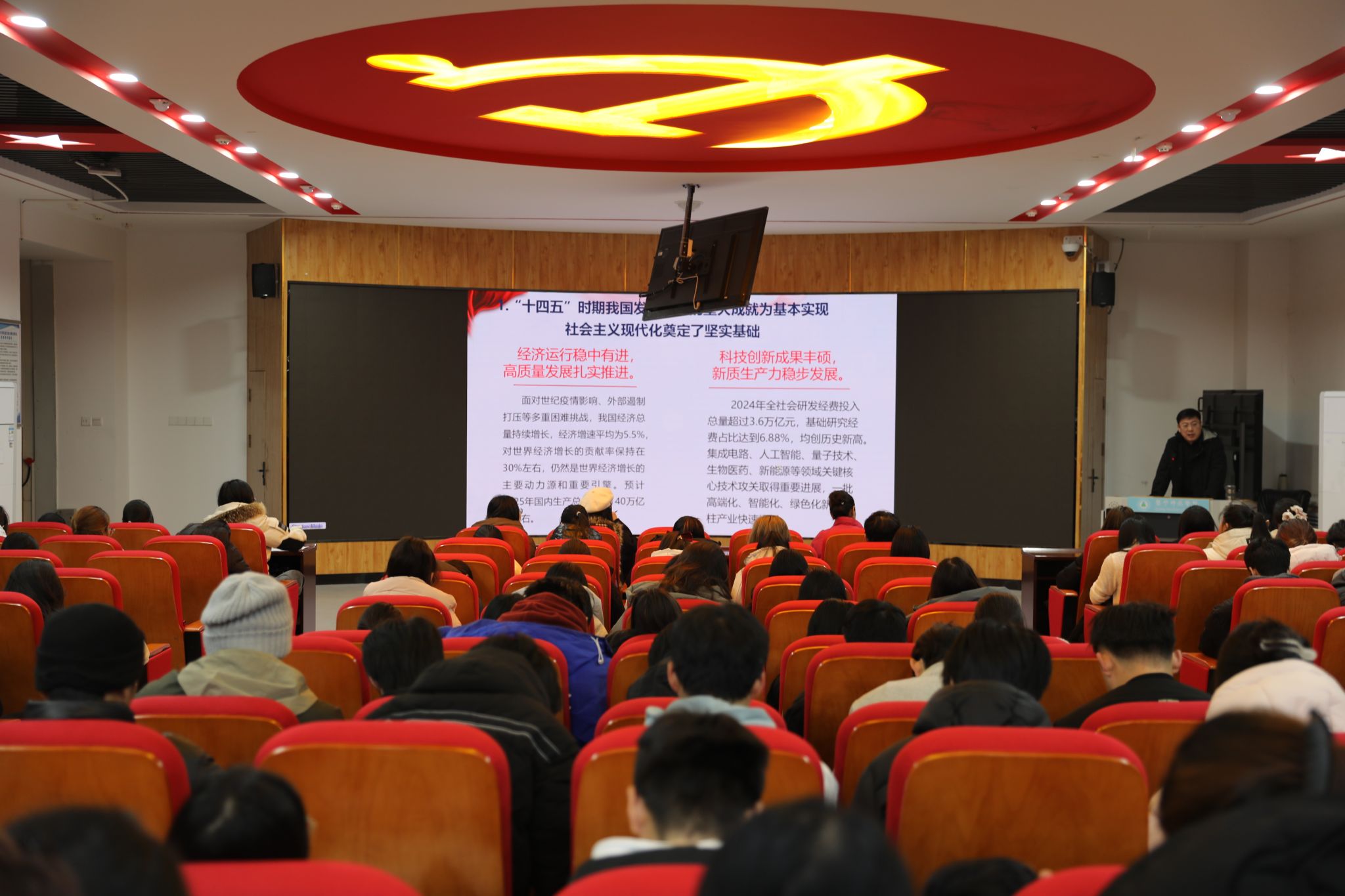 12月3日,李景杰为经济与管理学院学生讲授了题为“深学笃信党的二十届四中全会精神 接续推进中国式现代化”的专题课。他围绕学习贯彻党的二十届四中全会精神,对中国式现代化的科学内涵、本质要求、战略安排进行了深入解读,并结合经济发展新常态、国家治理体系与治理能力现代化等议题,分析了同学们面临的机遇与责任。他勉励同学们要持续加强党的创新理论学习,深刻理解中国式现代化道路的必然性与优越性,夯实专业基础,培养战略思维,努力成长为推进中国式现代化建设的栋梁之材。