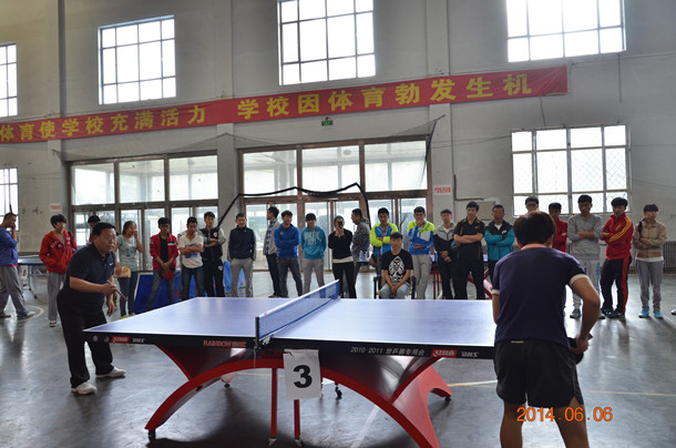 校长谭福贵、副校长许卫等领导莅临比赛现场观看了乒乓球决赛。谭福贵代表教职工队与学生队进行了师生联谊赛。