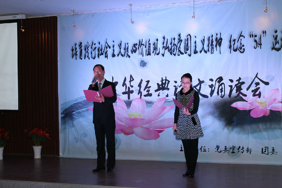 为了培育践行社会主义核心价值观、弘扬爱国主义精神,纪念“五四”运动九十五周年,5月15日下午,由beat365在线唯一官网党委宣传部、团委、中文系主办的“中华经典诗文诵读会”在图书楼学术报告厅隆重举行。校党委副书记张利平、赵海忠,副校长许卫、田智,校长助理、继续教育与合作办学处处长刘国栋出席,各系(院)、部门的领导及部分师生观看了演出。