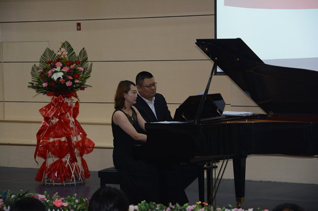 随后,廉莹与张凡现场进行演奏。演奏作品有四部分,分别是民歌改编、歌曲改编、舞剧改编和交响乐改编。其中,大家耳熟能详的作品,如《东方红》、《茉莉花》、《我爱北京天安门》、《运动员进行曲》等钢琴四手连弹。乐曲深得老师和学生们的喜爱,唤起了大家不同的情感体验。