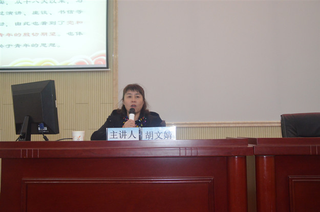 胡文婧以《让青春在砥砺奋斗中升华——践行习近平总书记的青年思想》为题,从理想、学习、品德、担当、奋斗、创新等方面讲述“志当存高远”、“人才有高下,知物由学”,“人无德不立”,“民族振兴是青年的责任”,“奋斗是青春最亮丽的底色”,“让创新成为青春远航的动力”等习近平总书记关于青年的重要思想。最后,围绕习近平总书记在纪念五四运动100周年大会上的讲话中对青年提出的六点要求,鼓励广大青年学生树立远大理想,敢于担当,勤奋学习,让青春在砥砺奋斗中升华。