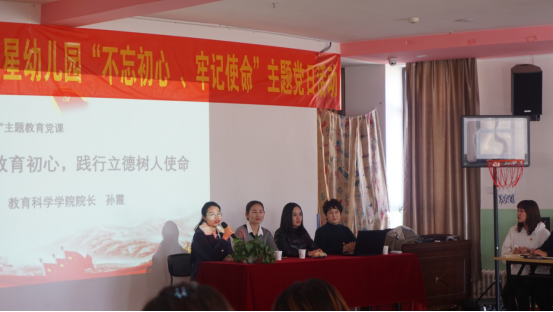 参观结束,孙霞为全体师生党员和在此实习的流动党员以及该幼儿园的老师们讲了一堂“坚守高等教育初心,践行立德树人使命”的主题教育党课。党课围绕“学习习近平关于立德树人的重要论述、准确把握立德树人的时代内涵、坚守高等教育初心,着力培养社会主义建设者和接班人”三个方面展开。孙霞引经据典、由浅入深着重阐释了教师职业道德的本质和以身立教的内涵,既有理论高度又有实践温度。同时,张妙珠和孙霞代表教育科学学院党总支为在此实习的两名党员再次送上了相关的学习资料,叮嘱她们一定要认真学习,以党员的标准严格要求自己,完成好实习的相关任务,在实习基地发挥好党员的模范带头作用。