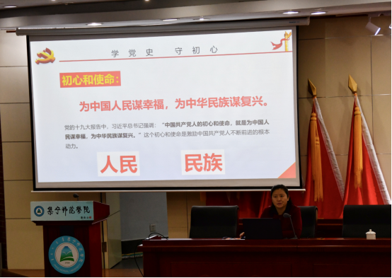 马克思主义学院教师张爱梅在题为“学党史,守初心”的讲座中,以党史为主线,从历史发展过程中“初心”的形成、“初心”实践以及新时代“初心”的内涵和意义等方面解读了中国共产党人的初心和使命。