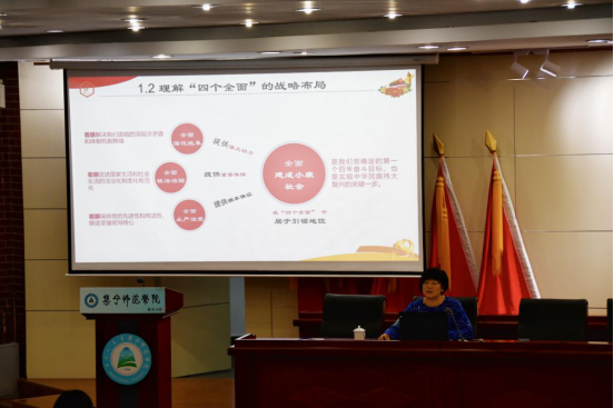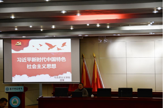 马克思主义学院教师温馨在题为“习近平新时代中国特色社会主义思想”的讲座中,从习近平新时代中国特色社会主义思想的创立背景、科学内涵、历史地位等方面进行了讲解,阐释了习近平新时代中国特色社会主义思想是马克思主义中国化的最新成果,是新时代的精神旗帜,也是实现中华民族伟大复兴的行动指南。