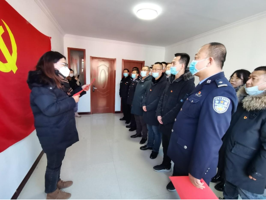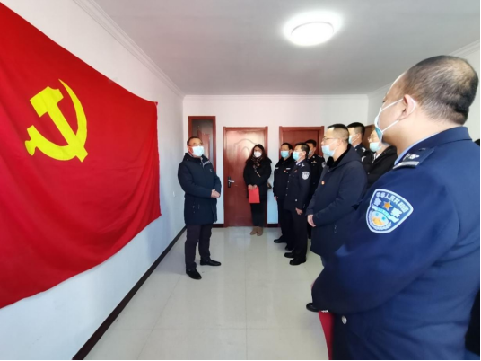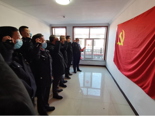 白海子派出所党支部书记王海兵带领全体党员面对党旗重温入党誓词,大家用铿锵有力的声音,表达了对党忠诚的决心。