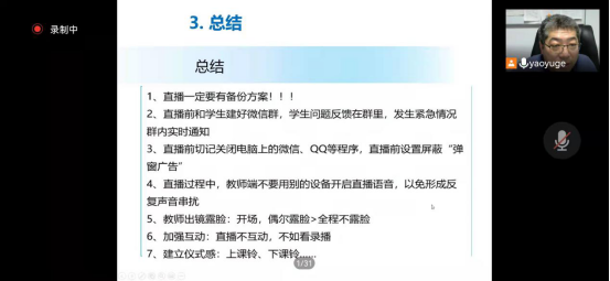 本次培训由教务处处长姚玉阁主讲。姚玉阁以《如何有效开展线上教学》为题,从线上教学的必要性入手,对线上教学中录播、直播到教学平台的选择和线上教学的全过程,进行了详细而有针对性的指导,特别是对线上教学过程这部分内容,他以学习通为例,通过屏幕共享的方式演示了从课前准备、课中直播以及课后作业、辅导答疑等全过程、全方位的操作流程。培训最后,与听课教师进行了线上互动答疑。