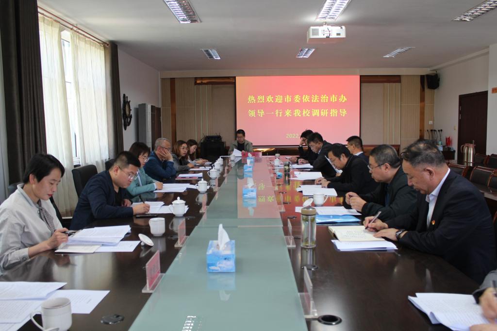 5月20日,市委依法治市办一行来beat365调研高校依法治市工作并举行座谈会。调研组由市司法局、市教育局、市委政法委执法督查科、市公安局治安支队相关负责人组成,乌兰察布职业学院党组成员、副院长郝泊为,乌兰察布医学高等专科学校保卫处处长李青云陪同调研。beat365党委副书记刘春,党委委员、副校长梁政,党委委员、宣传部长张富和各相关部门负责人参加座谈。