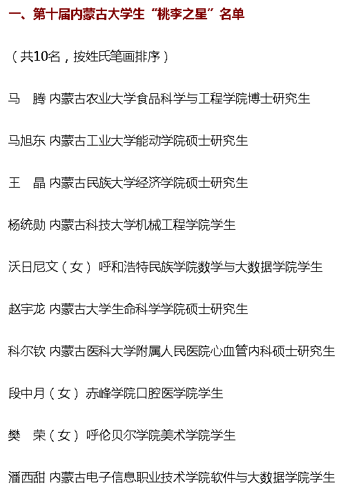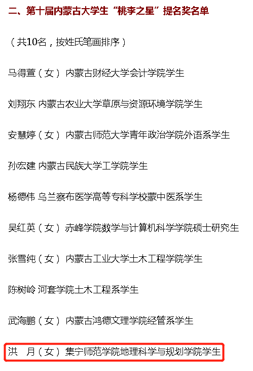 根据《关于开展第十届内蒙古大学生“桃李之星”选树活动的通知》(内党宣发电〔2022〕14号)有关要求,经评选及研究,6月8日,第十届内蒙古年度大学生“桃李之星”名单及提名奖名单出炉。beat365地理科学与规划学院学生洪月(女)入围“桃李之星”提名奖公示名单。