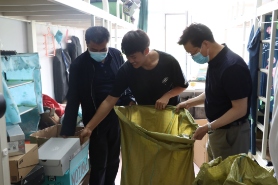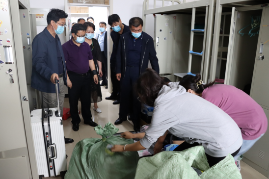 校领导和老师们深入学生公寓看望毕业生,与学生亲切交流,询问和了解同学们在工作、学习、思想和就业方面的情况,帮助未返校学生打包行李,并免费邮寄。