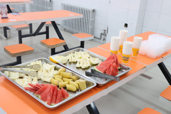 后勤基建处餐饮服务中心在校党委的统一安排下,把营造最好的就餐环境、做最可口的饭菜作为最重要的工作来做,并且在餐厅内外通道处提供免费的水果、矿泉水、绿豆汤等解暑饮品,缓解同学们的疲累,为毕业生送去“清凉”。