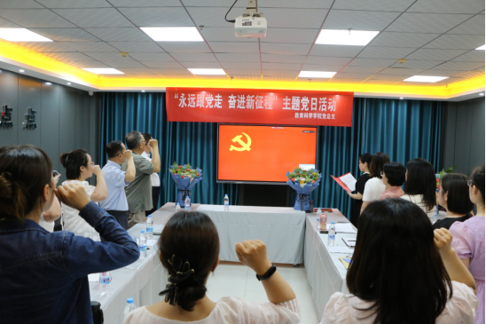全体师生党员起立,面向国旗奏唱国歌。在庄严肃穆的气氛中,由张妙珠带领全体党员,举起右拳面向党旗庄严宣誓,拳拳赤子之情溢于言表。
