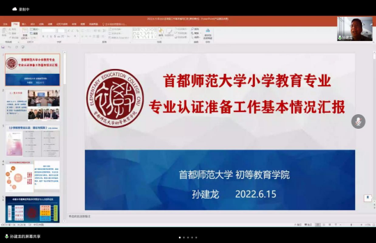 首都师范大学初等教育学院孙建龙副院长介绍了小学教育专业认证情况,他讲到近几年专业建设的总体路径与方向,整体设计体现中国特色、国际视野、儿童取向、综合培养、学科引领、大小融合等。对卓越小学教师培养的办学理念与人才培养定位进行了解读。交流发言中,教育科学学院教师赵明坤就实习实践环节设计思路等相关问题与孙建龙老师进行了讨论。