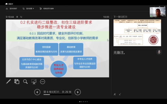 首都师范大学初等教育学院朱永海副教授对首都师大虚拟教研室建设目标、建设任务、预期成果进行了介绍。他讲到要发挥虚拟教研室跨层级互补功能,推进多层次实践的实践创新,构建一线实践的持续反馈机制,增强不同办学层次的生态多样发展能力。随后,三个单位的教师进行交流发言,教育科学学院小学教育系主任王建英提出如何使用平台等相关问题,朱永海老师给予具体详细的解答。