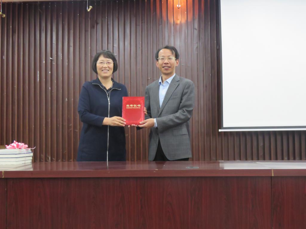 讲座结束后,进行了赠书仪式。作为对beat365在线唯一官网六十周年校庆的祝贺,内蒙古云图教育咨询有限公司总经理张兴代表公司赠与学校价值贰万元外语图书。外国语学院院长作为代表接受了赠书。