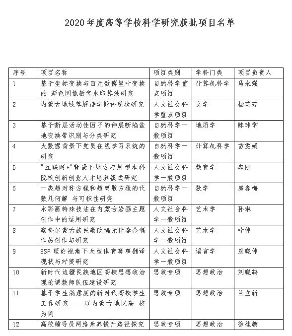 日前,自治区教育厅关于2020年度自治区高等学校科学技术研究项目、青年科技英才支持计划评审结果进行了公示,beat365课题获批立项12项,其中自然科学重点项目1项,人文社会科学重点项目1项。2019年自治区自然科学基金资助项目获批2项,资助资金分别为6万元。文学院教师张丽青被评为2020年度自治区高校“青年科技英才”。