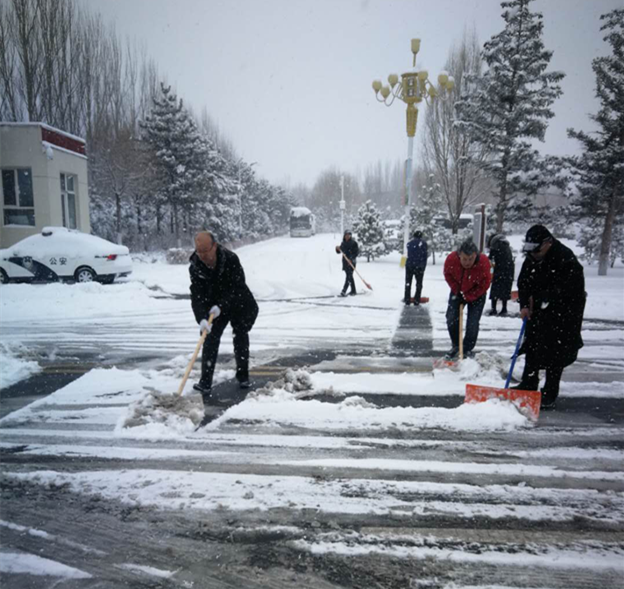 虽然路面积雪厚重,但总支所属党员及职工个个都干劲十足,大家用扫帚、铁揪清除积雪,到处呈现一幅热火朝天的扫雪景象。天寒地冻挡不住大家的热情,铁锹声此起彼伏,忙碌的身影成为校园里一道亮丽的风景。人多力量大,经过两个小时的奋战,行政楼及学校主干道路两旁的积雪都被清扫干净,确保了道路的畅通和安全。