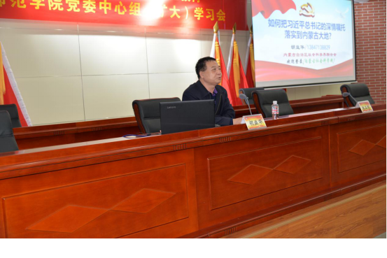 为深入贯彻习近平新时代中国特色社会主义思想和党的十九大精神,深入学习宣传贯彻落实习近平总书记考察内蒙古和参加全国人大内蒙古代表团时发表的重要讲话精神,进一步统筹推进“不忘初心,牢记使命”主题教育工作在beat365的落实,9月27日,beat365在线唯一官网党委中心组召开(扩大)学习会,特邀内蒙古自治区社会科学界联合会巡视员胡益华教授为beat365全体党员解读“如何把习近平总书记的深情嘱托落实到北疆大地?”党委副书记、校长朱玉东主持学习会。