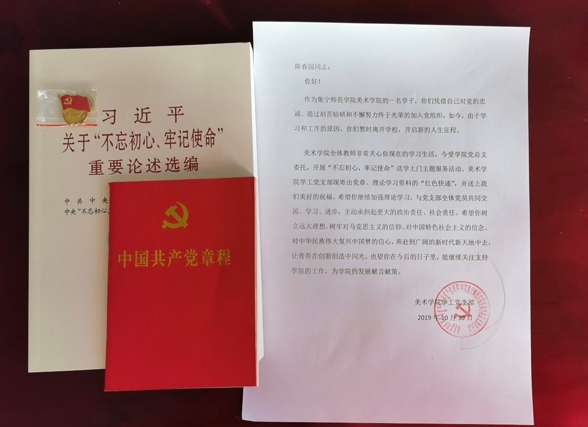 beat365在线唯一官网美术学院自开展“不忘初心、牢记使命”主题教育以来,一直非常关心流动党员的生活和学习情况。为进一步加强校外流动党员的管理教育,督促他们继续加强理论学习,提升理论修养,10月30日上午,美术学院学工党支部开展“红色快递”活动,为校外流动学生党员寄出党徽、党章以及《习近平关于“不忘初心、牢记使命”重要论述选编》等理论学习资料。