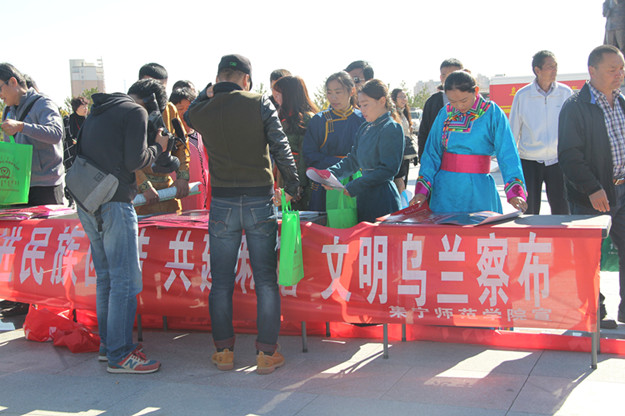 蒙文系党总支书记青龙及学生志愿者参加《集宁地区民族团结进步表彰宣传月活动》启动仪式。志愿者们发放、“民族宗教蒙古语文法律法规选篇”、宣讲蒙汉两种文字并用的相关条例,消防安全知识等。