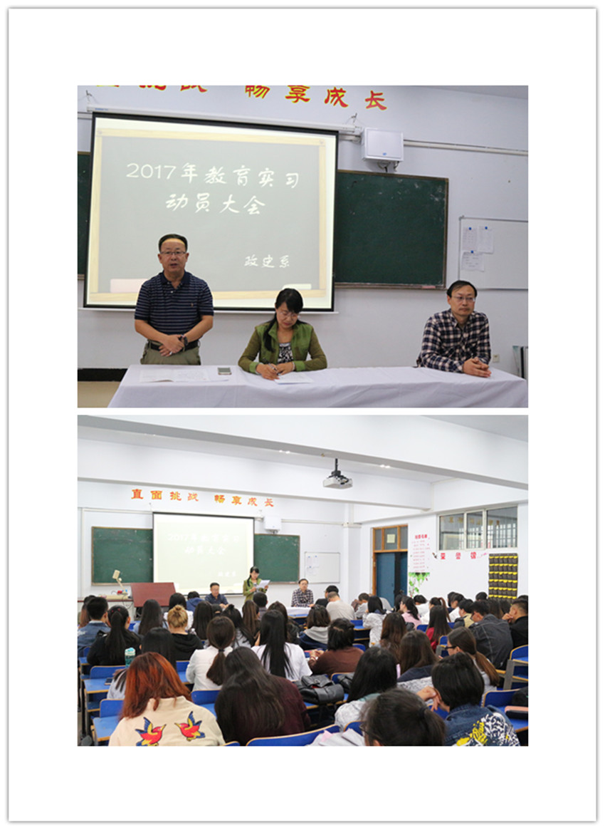 政史系主任杨福和作了动员讲话,要求各学生充分认识教育实习的重要性,端正态度,做好实习工作,珍惜实习机会,以虚心好学、主动勤奋、认真严谨的态度做好实习工作,时刻把安全放在首位,提高安全防范意识。