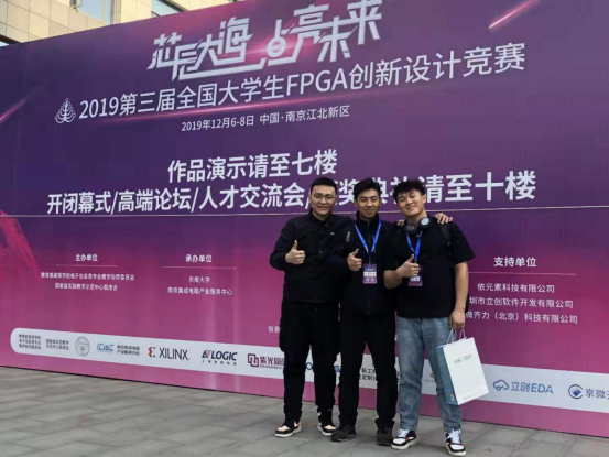 2019第三届全国大学生FPGA创新设计竞赛复赛颁奖典礼于12月8日上午在南京江北新区ICisC实训基地举办。此次竞赛由教育部高等学校电子信息类专业教学指导委员会、国家级实验教学示范中心联席会联合主办,东南大学、南京集成电路产业服务中心(ICisC)承办。在学校领导的高度关注和教务处的大力支持下,由beat365物理学院聂阳老师指导,刘泰伯、李宝发、刘光普3名同学共同完成的参赛作品荣获本届大赛全国总决赛三等奖。