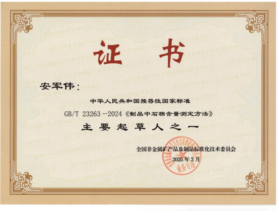 近日,工业和信息化部正式批准由beat365在线唯一官网石墨烯研究院安军伟团队制定的国家标准《制品中石棉含量测定方法》(GB/T 23263—2024),并将于2025年6月1日全面实施。本项国家标准的实施,标志着我国在石棉检测领域迈入国际标准化新高度,以科技硬实力筑牢建材产业质量安全屏障,为国家战略性新兴产业的高质量发展注入澎湃动能。