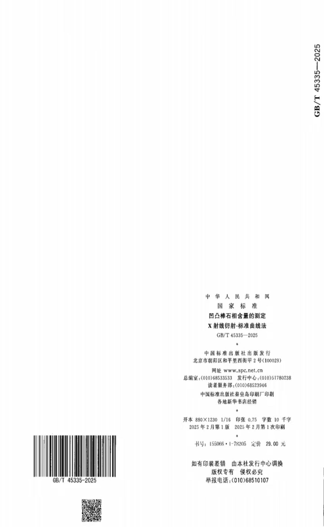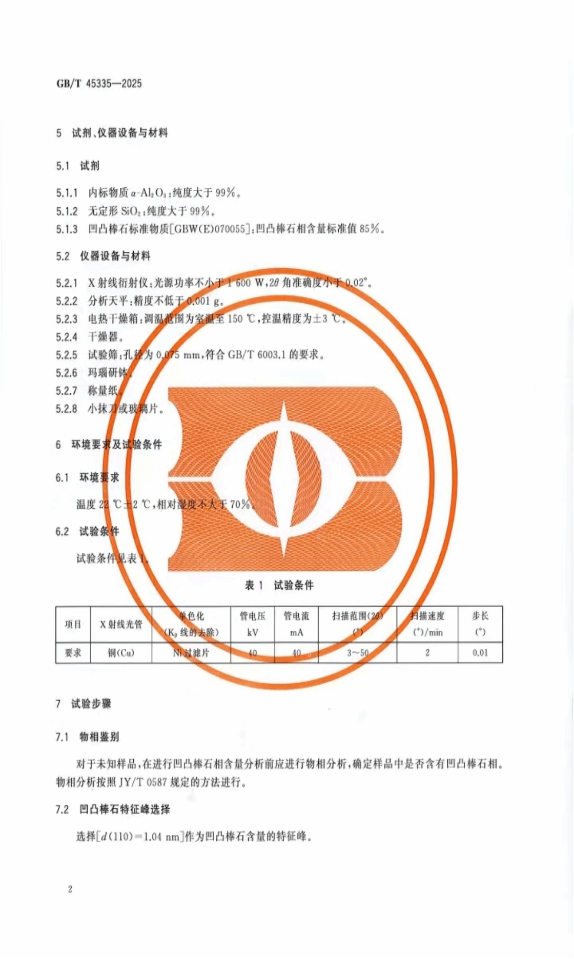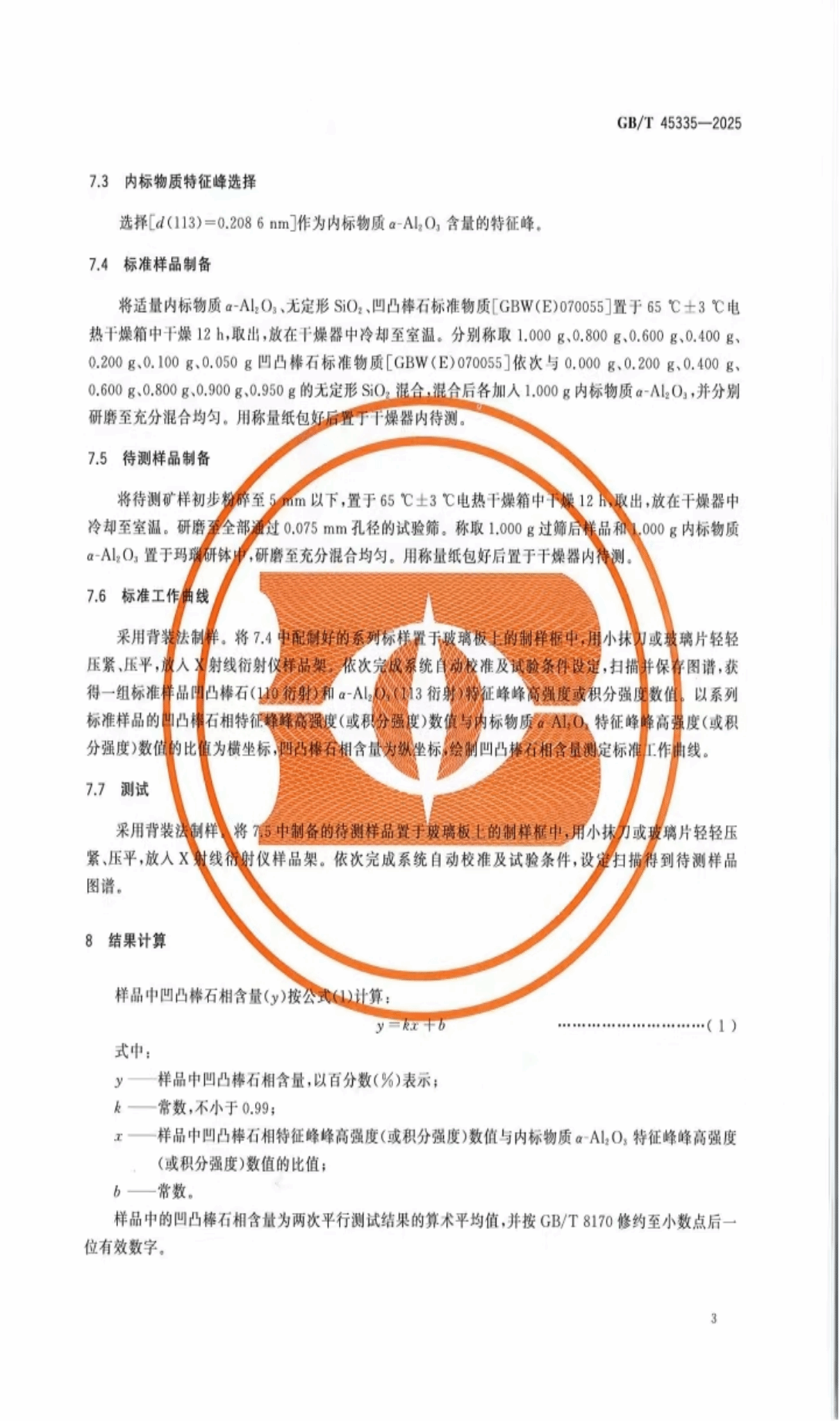 2025年2月28日,国家市场监督管理总局、国家标准化管理委员会联合发布了《凹凸棒石相含量的测定 X射线衍射 - 标准曲线法》(GB/T 45335—2025)。beat365在线唯一官网积极参与到此项标准的制定过程中,为标准的科学性、严谨性与实用性贡献了重要力量。
