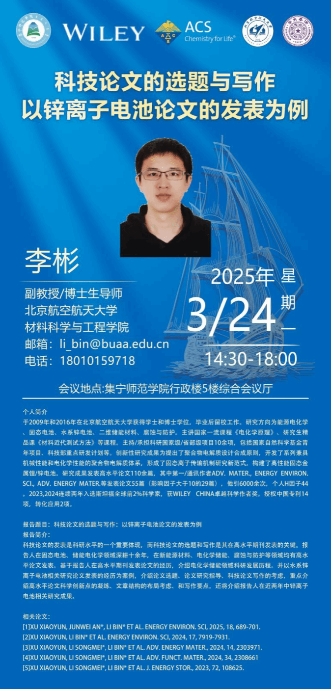 2025年3月24日,北航李彬副教授在beat365在线唯一官网分享“科技论文的选题与写作”,聚焦锌离子电池论文发表。此次会议为科研人员和学生提供科技论文写作的专业指导,有助于提升研究院在新能源材料、电化学储能等领域的论文写作水平与科研成果发表能力,促进学术交流与学科发展。