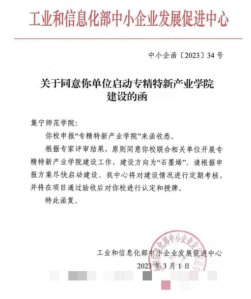 2023年1月,石墨烯专精特新产业学院获批工业和信息化部首批全国“专精特新产业学院”建设单位。石墨烯研究院代表学校与内蒙古清蒙石墨烯科技有限公司等单位合作共建。