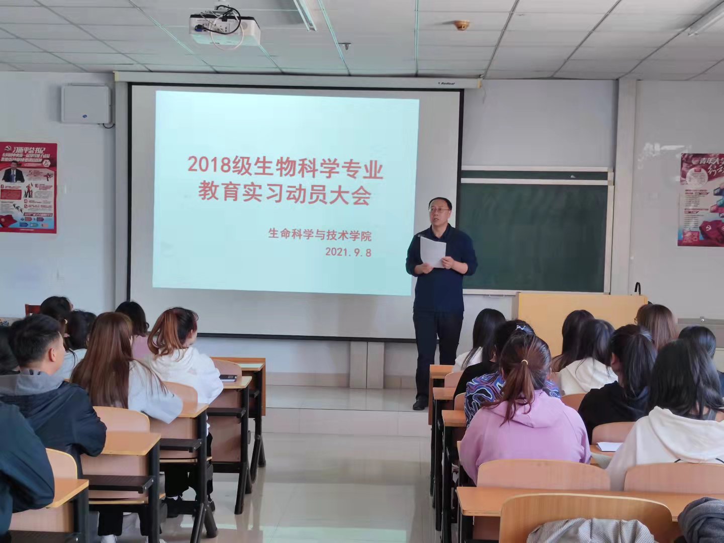 2021年9月8日下午,生命科学与技术学院召开了2018级生物科学专业教育实习动员大会。本次动员会由生命科学与技术学院副院长穆俊祥主持,院长任琴教授、学院全体指导老师及2018级生物科学专业全体同学参加了本次动员会。