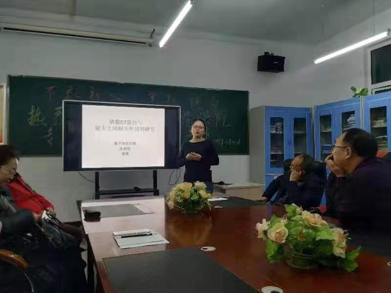 交流考察团一行首先走进医专生物化学与分子生物学实验室和细胞培养实验室,听取了医专教师张春强博士关于该科研平台的详细介绍,随后展开了学术交流会。会上由生科院教师王丹、贺番和王燕琴3名博士,分别作了主题为“马铃薯品种选育”、“猪瘟蛋白E2”以及“口蹄疫病毒”研究情况的报告,医专基础医学部教师与主讲人就实验方法、仪器、技术路线及发展前景等方面进行了互动交流。