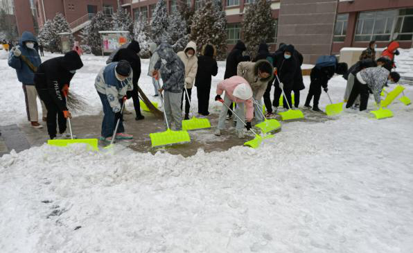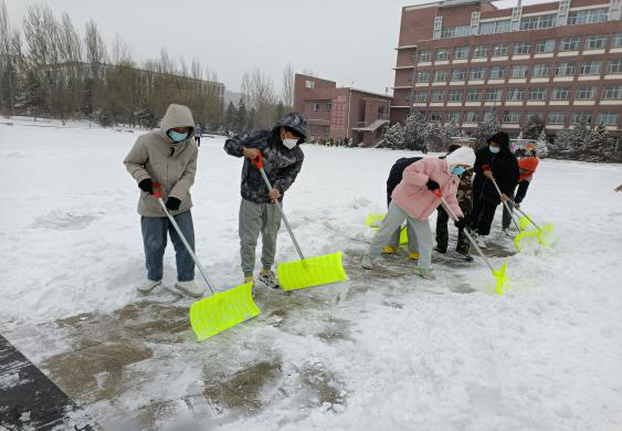 参加扫雪的同学们,早早到指定地点集合,自动分组,积极投入到除雪队伍中。大家齐心聚力,铲的铲、推的推,不畏严寒,挥舞着铁锹对主教楼附近及路上的积雪和结冰进行清理。同学们相互帮助、其乐融融的劳动热情给寒冷的冬天带来了浓浓的暖意。