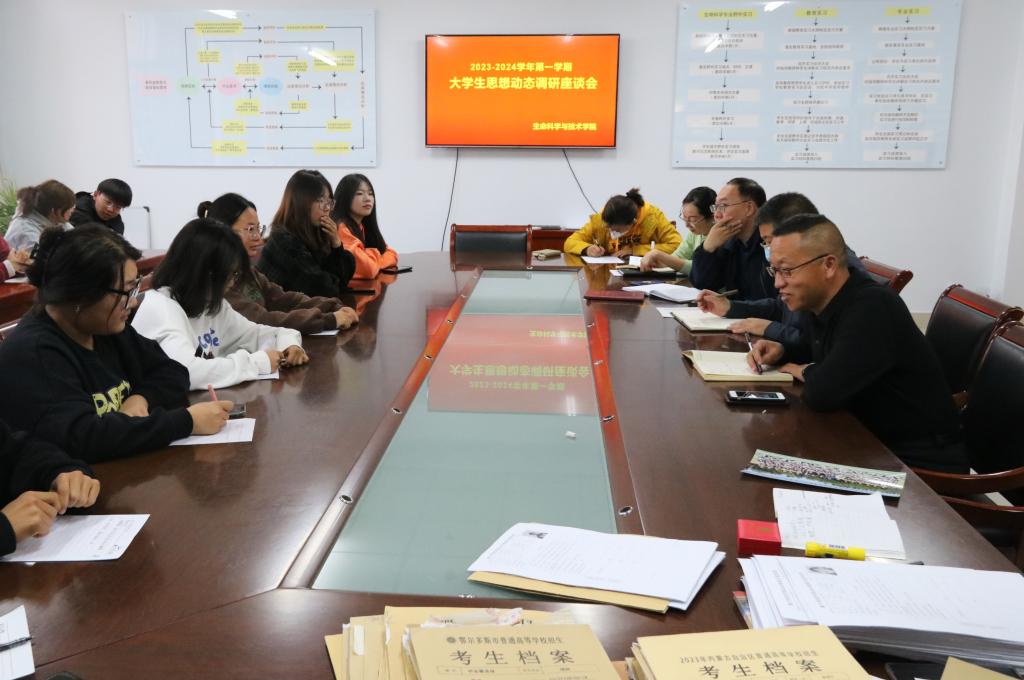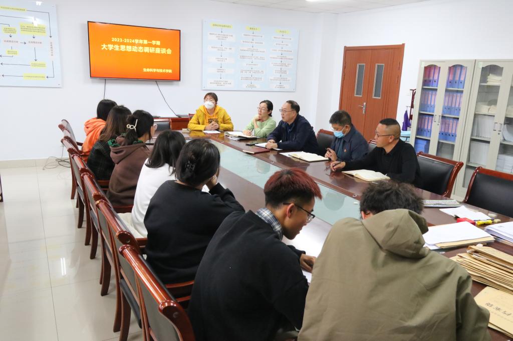 为及时掌握学生思想动态,把握学生关心关注的热点难点问题,进一步提高大学生思想政治教育工作的针对性和实效性,我院于10月12日组织召开了2023--2024学年第一学期大学生思想动态调研会。本次会议由团总支书记张荟主持,党总支书记夏学利、院长穆俊祥、党总支副书记张明东、副院长韩海霞及各班级学生干部代表、普通学生代表和少数民族学生代表参会。