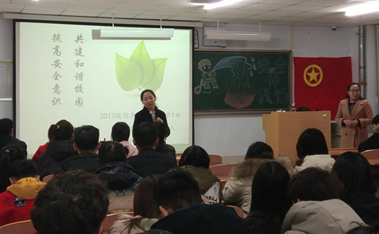本次班会由2017级信息与计算科学一班组织开展,主题为《提高安全意识,共建和谐校园》。会上,班主任高丽丽围绕人身安全、消防安全、交通安全、校园网贷、信息安全、食品安全、心理健康等多个方面对学生进行了安全教育,并与学生进行互动。